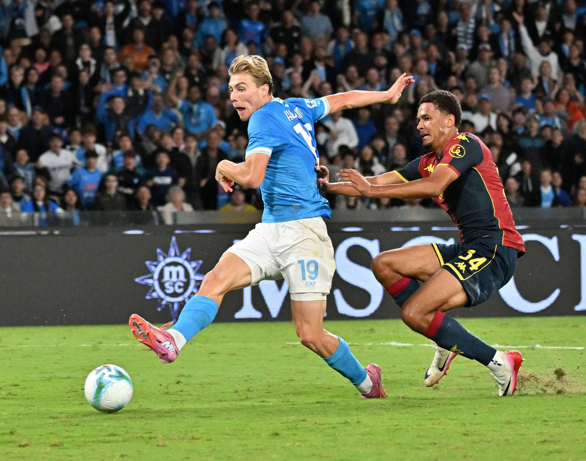 10月5日,那不勒斯队球员霍伊伦(左)与热那亚队球员奥托阿在比赛中拼抢。 新华社发